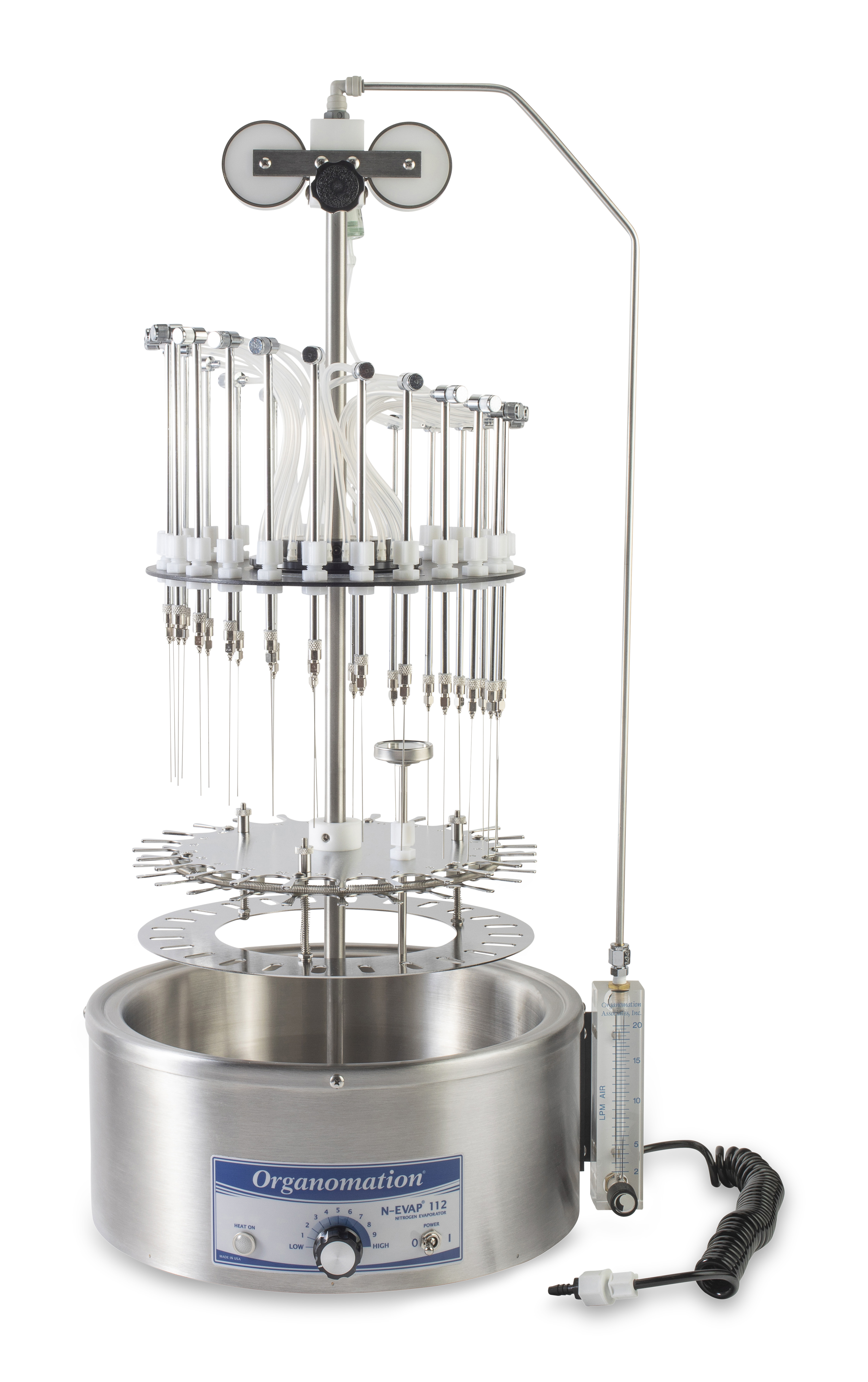 配備: 可調式氣體流量計 (0–20 LPM)、耐高壓Teflon管、過溫保護裝置、不銹鋼4"x19號針、可調式水浴溫度裝置、手動雙彈簧樣品托盤升降