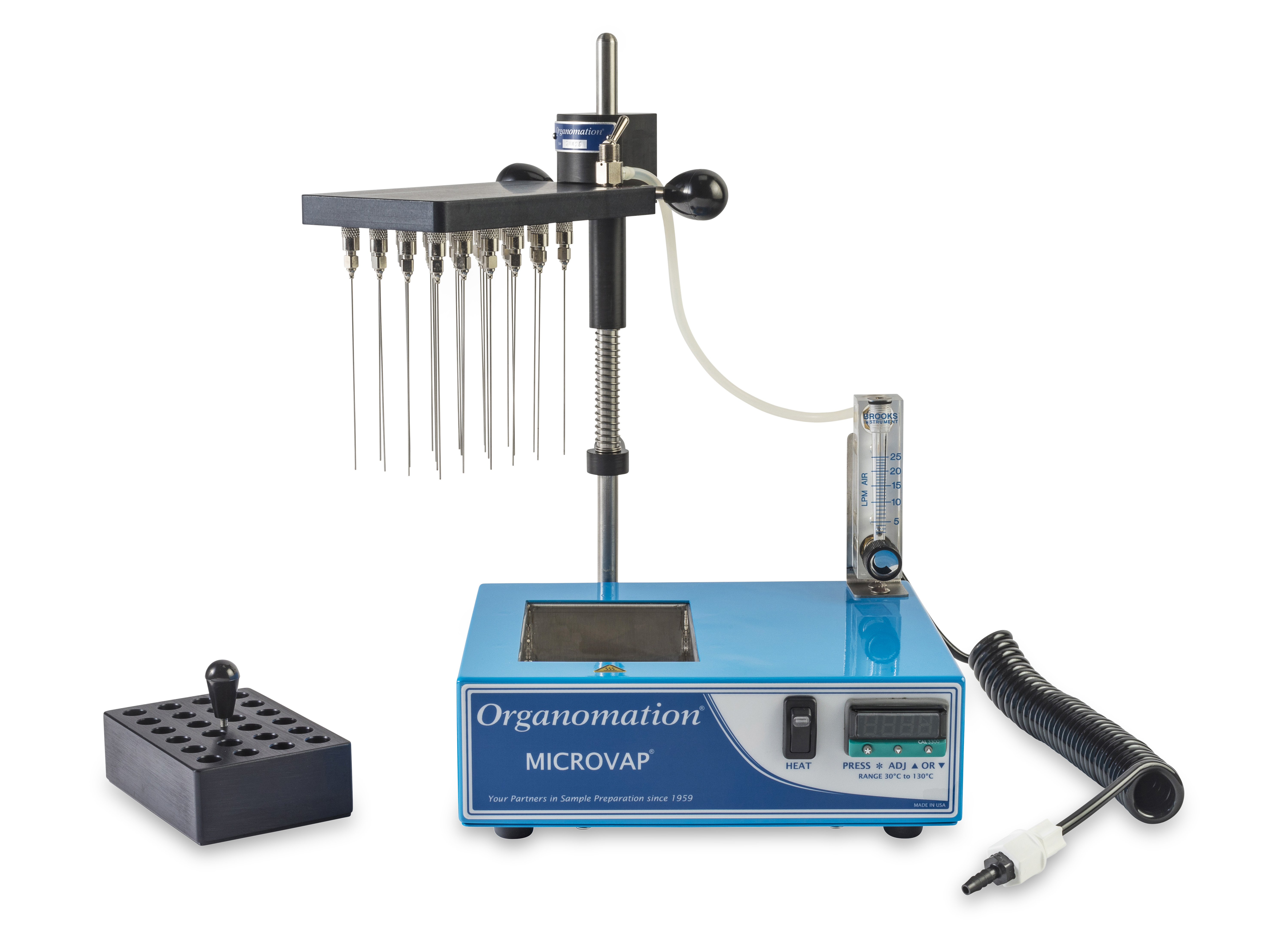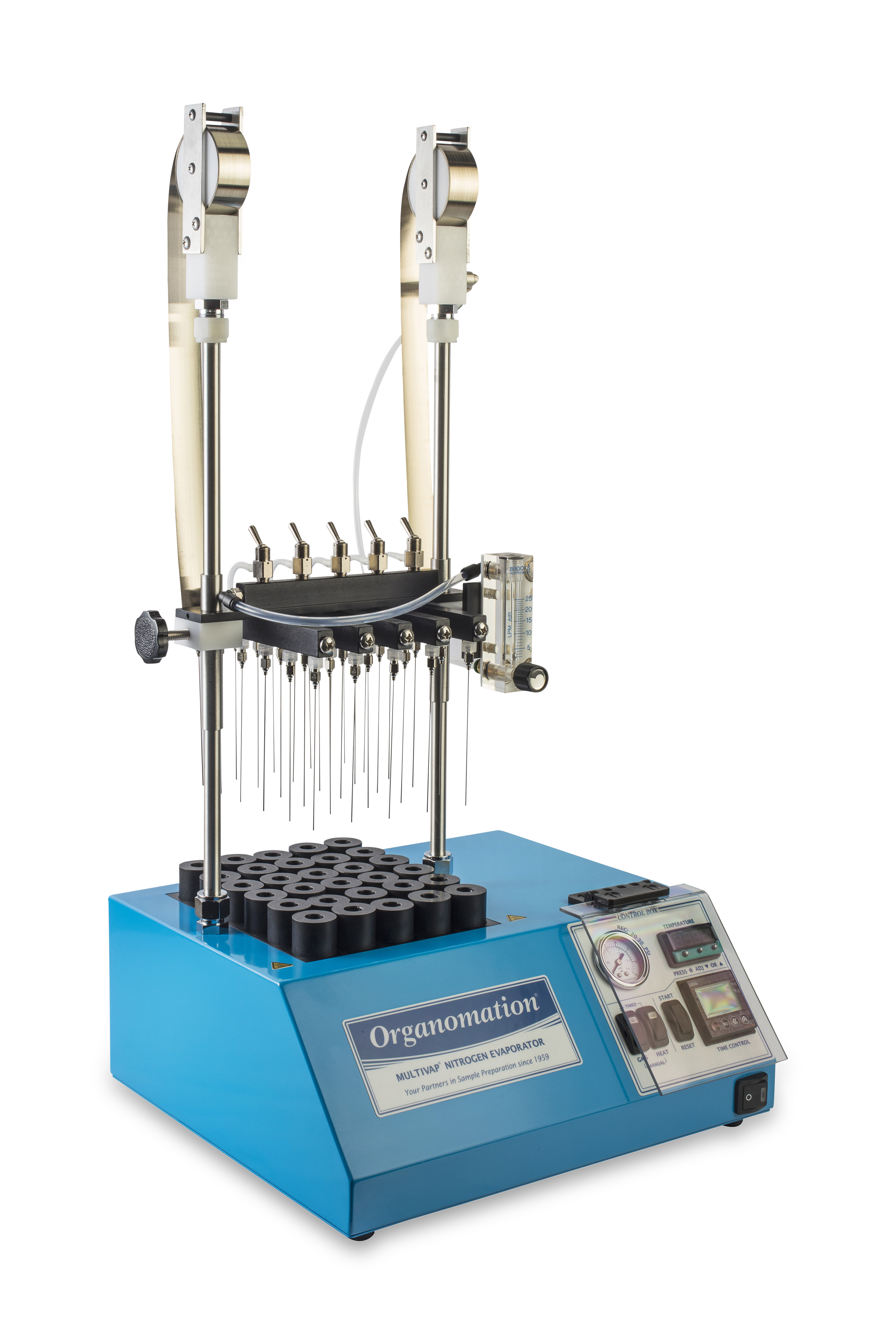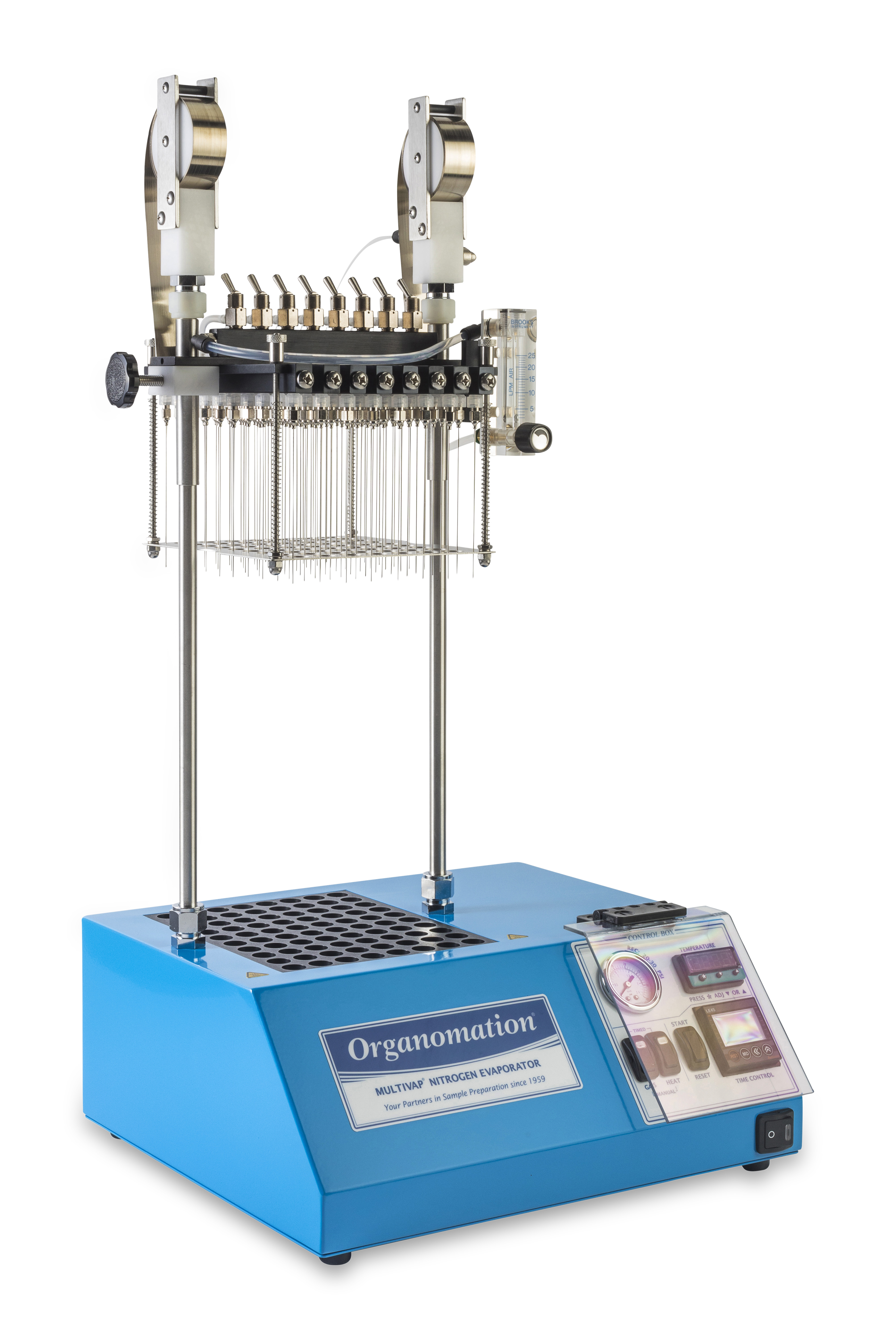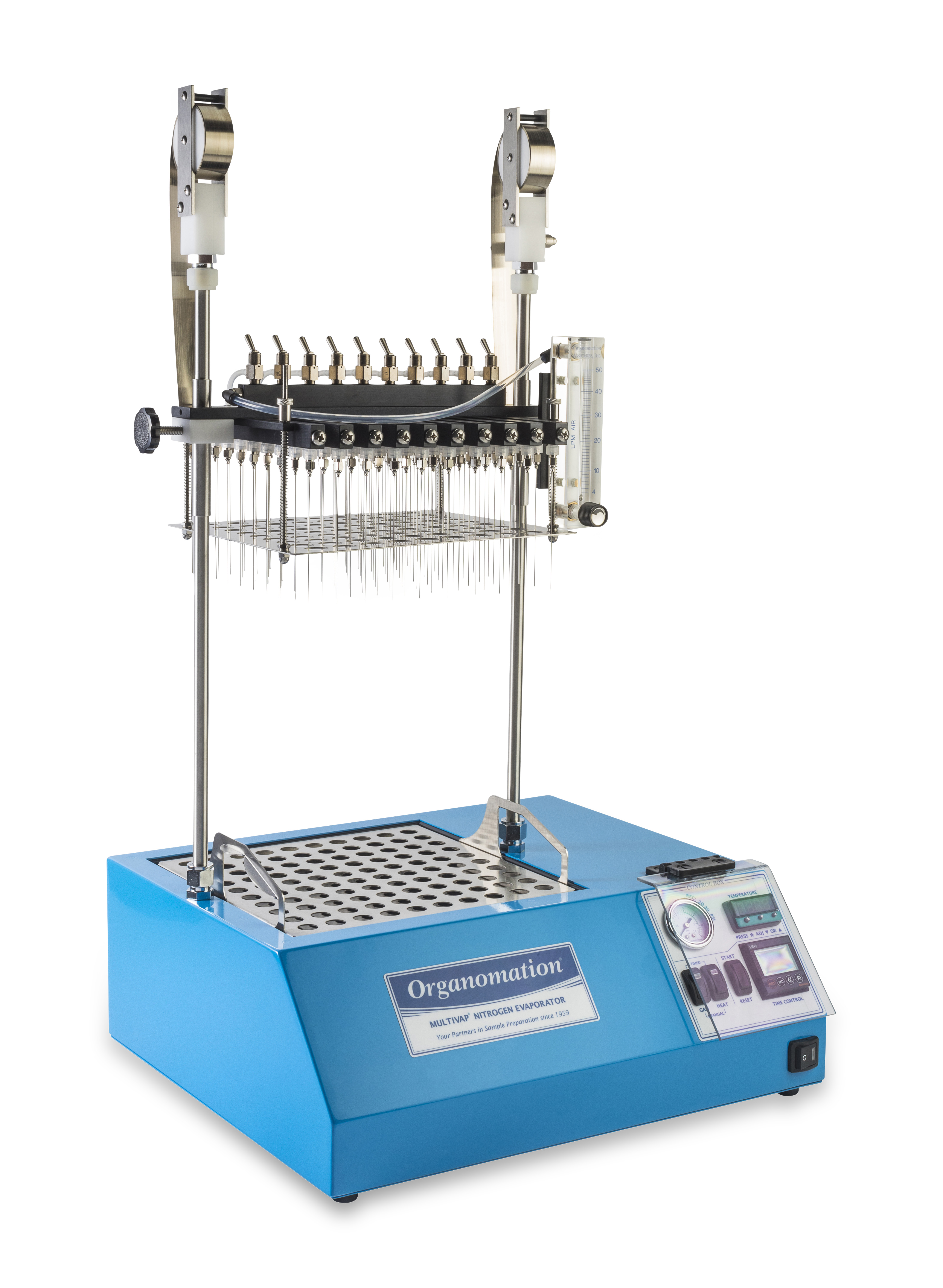 配備: 可調式氣體流量計、耐高壓Teflon管、數位顯示設定溫度、濃縮計時器、吹氮針省力提舉裝置、控制器安全護蓋、氣體分流控制閥、氮氣過濾器