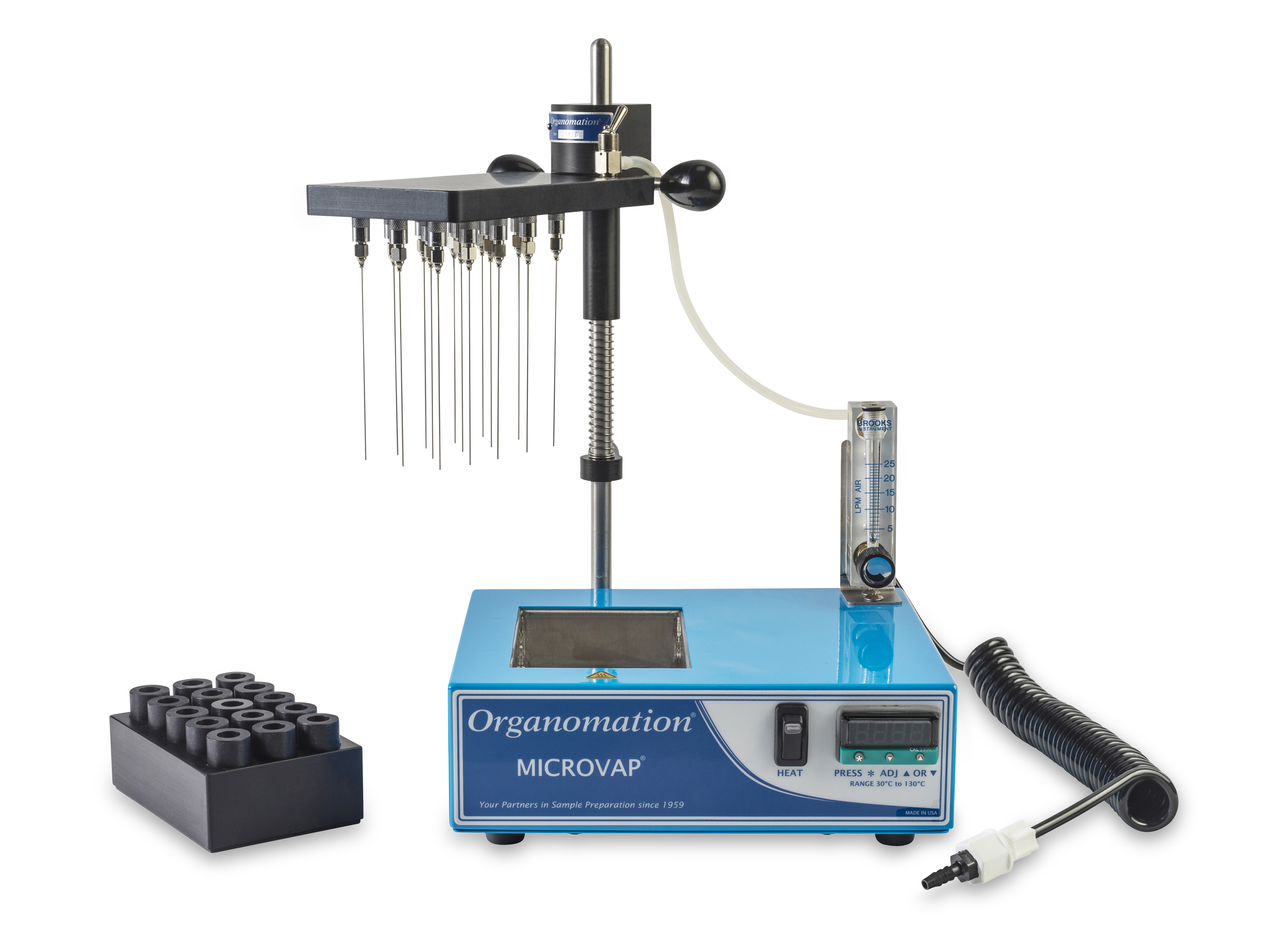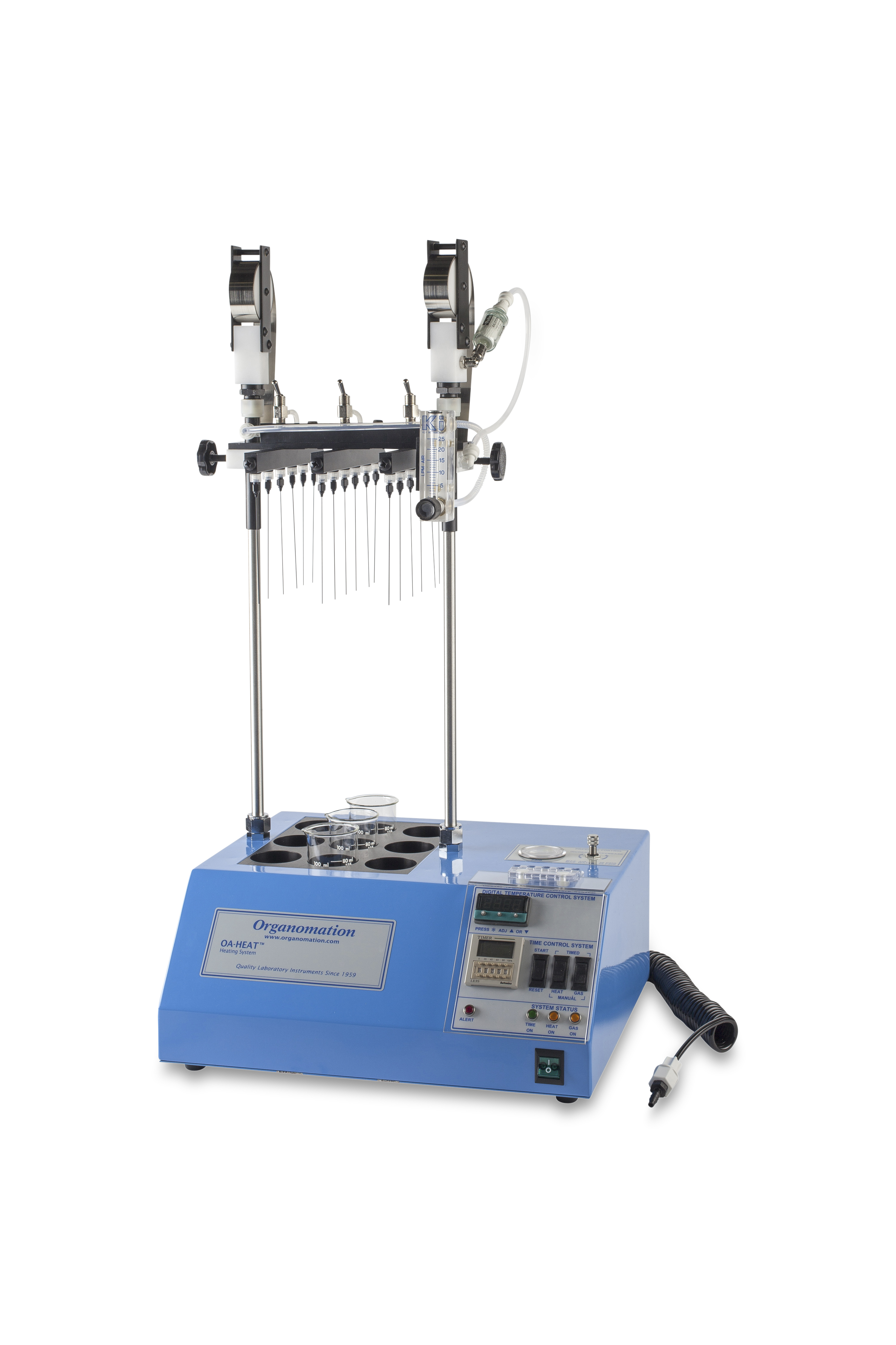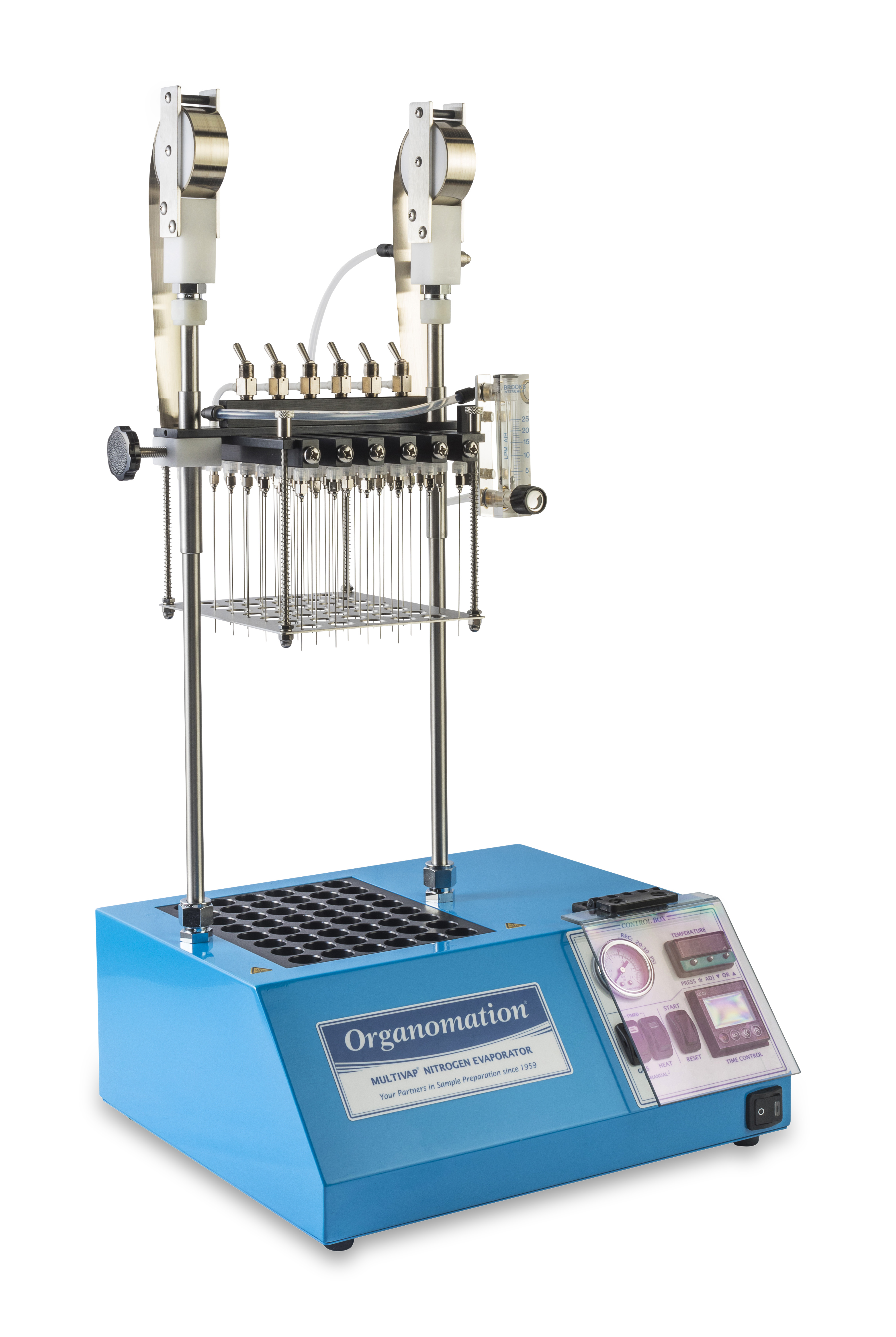 配備: 可調式氣體流量計、耐高壓Teflon管、數位顯示設定溫度、濃縮計時器、吹氮針省力提舉裝置、控制器安全護蓋、氣體分流控制閥、氮氣過濾器