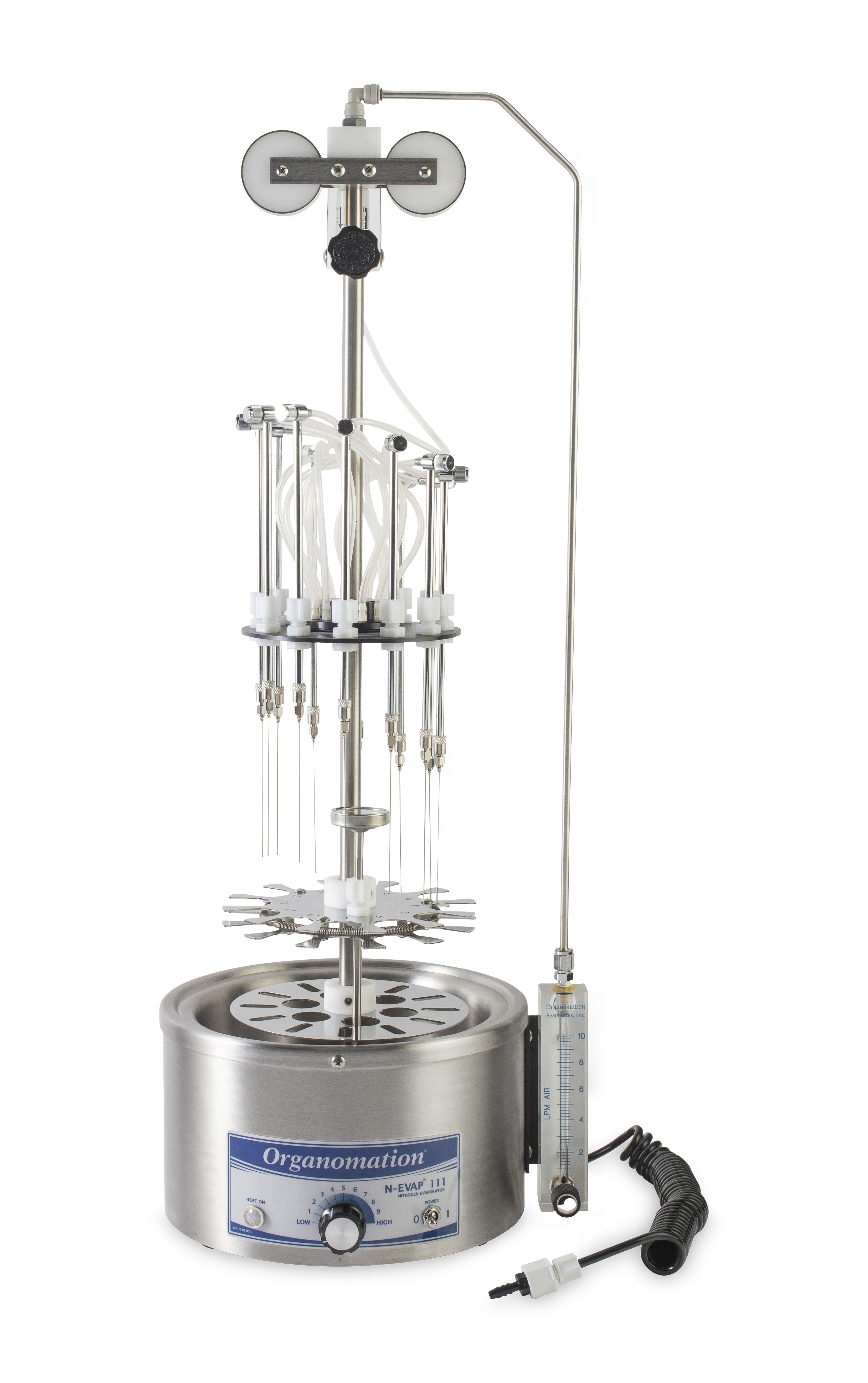 配備: 可調式氣體流量計 (0–20 LPM)、耐高壓Teflon管、過溫保護裝置、不銹鋼4"x19號針、可調式水浴溫度裝置、手動雙彈簧樣品托盤升降